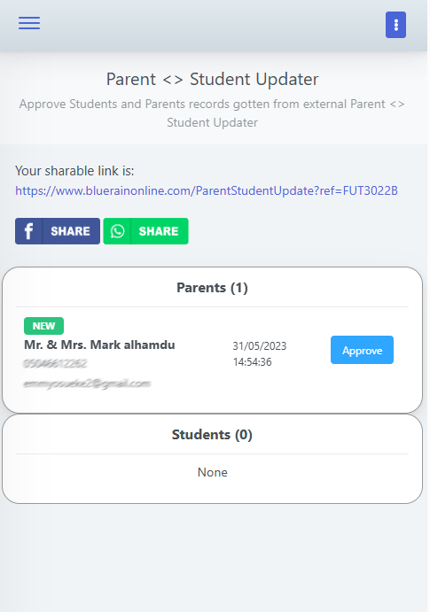 Our Parent-Student Updater feature revolutionizes how schools collect and maintain accurate student and parent contact information. This module allows you to generate and distribute secure, personalized update links to parents via convenient social platforms (e.g., WhatsApp, Facebook Messenger, school social groups).